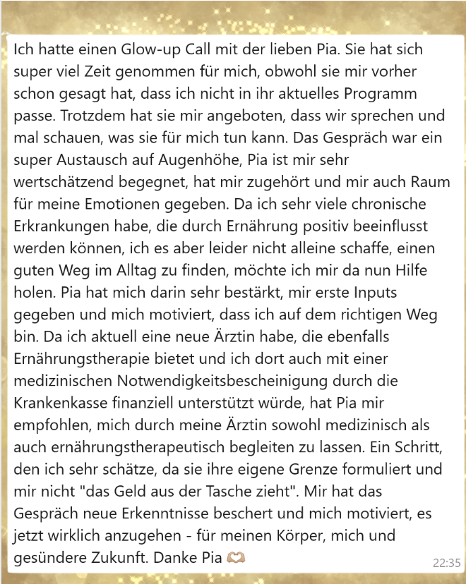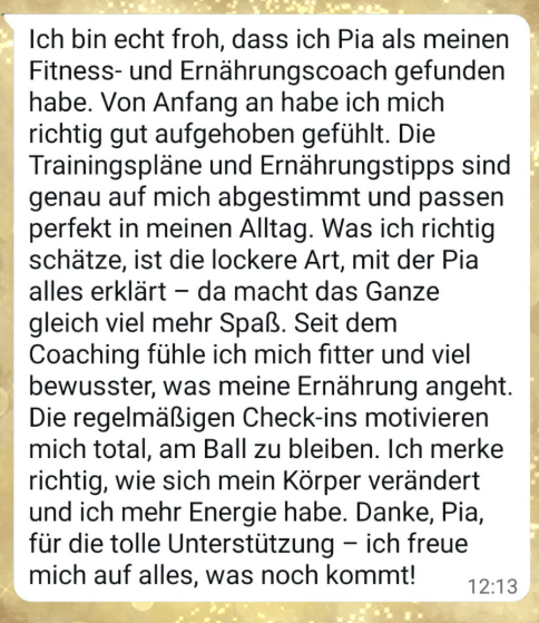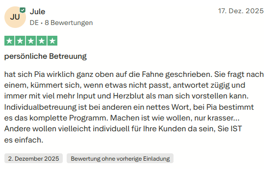 Durch die regelmäßigen Inputs und Calls konnte Jule in diesen 2 Wochen erste Strukturen aufbauen und befindet sich nun auf dem besten Weg in ihren neuen Lifestyle, der sie nicht nur ihren Zielen weiterbringt, sondern auch definitiv glücklich macht!